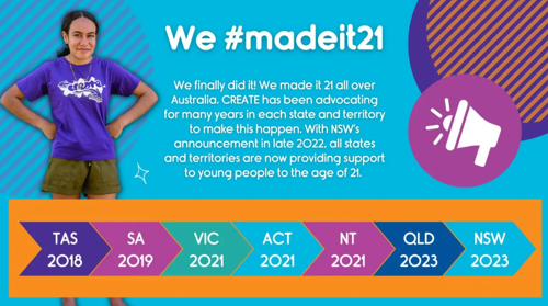 We did it! Thanks to the hard work of CREATE's Young Consultants using their voices, all Australian States and Territories now support young people in care to the age of 21! We are very proud of our advocacy and our amazing young people.